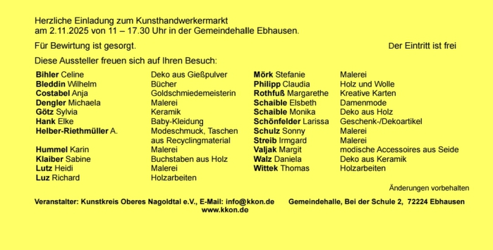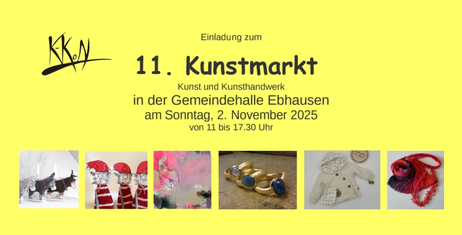 Wie jedes Jahr, organisieren wir wieder den Kunsthandwerkermarkt in der Gemeindehalle in Ebhausen. Eine schön Mischung aus Kunsthandwerk und Malerei erwartet die Besucher.